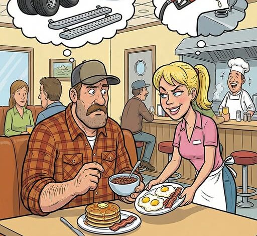 Das Straßencafé war brechend voll, wie man es nur von Raststätten kennt – Stiefel kratzten über die Fliesen, Krüge klirrten, und draußen dröhnten Motoren im Leerlauf wie ein unruhiger Herzschlag. Ein Fernfahrer drängte sich mit breiten Schultern und kilometerverschmierter Jacke durch die Tür und ließ sich in eine Vinylsitzbank gleiten, die mehr Geschichten erlebt hatte als die meisten Menschen. Er brauchte die Speisekarte nicht zu öffnen.