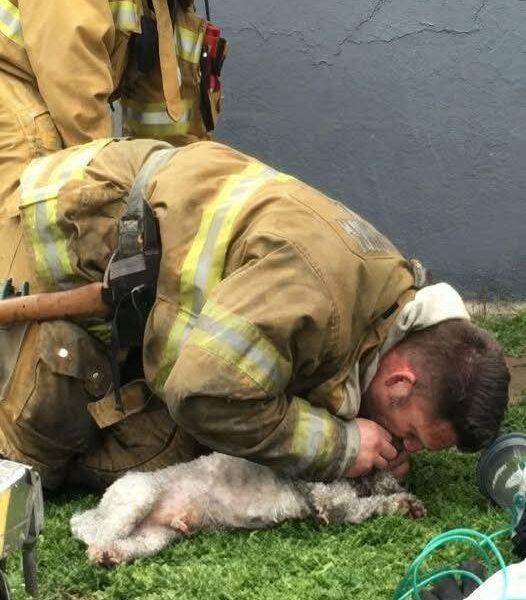 - Eine mutige Gruppe Feuerwehrleute rettete einen leblosen Hund aus einem verheerenden Brand und führte eine Mund-zu-Schnauze-Beatmung durch, um das Tier wieder zum Leben zu erwecken, nachdem es aus den Flammen gezogen worden war.