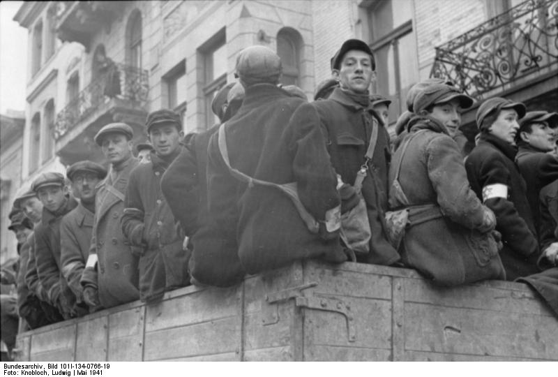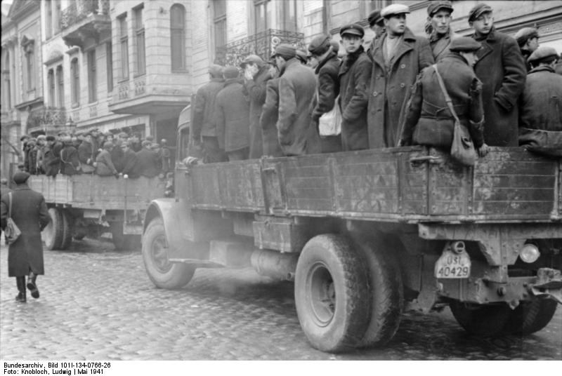 Juden aus dem Warschauer Ghetto werden in offenen Lastwagen transportiert