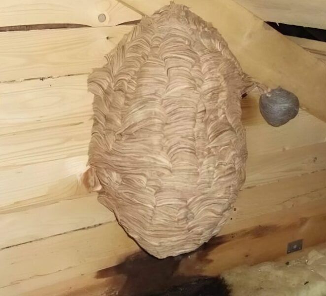 Also nahm ich eine Taschenlampe und stieg nach oben. Die Luft war warm und trocken, und an der Wand entdeckte ich schließlich etwas, das sofort ins Auge fiel: eine große, papierartige Struktur mit runden Schichten. Bei näherem Hinsehen erkannte ich, dass es ein Wespennest war.