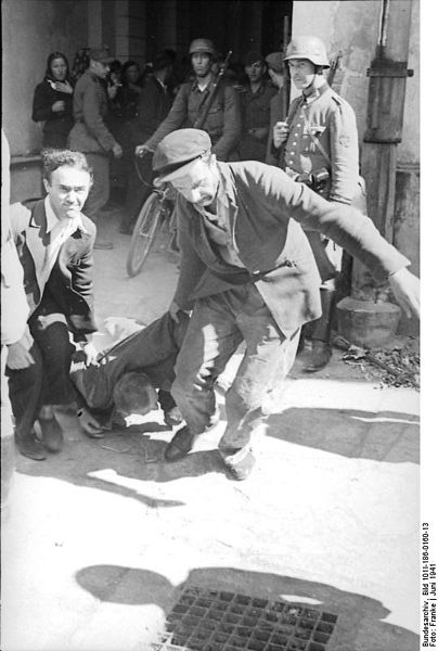 Die Sowjetunion – Ein jüdischer Mann wird von Einheimischen durch die Straßen gezogen, während deutsche Soldaten zuschauen