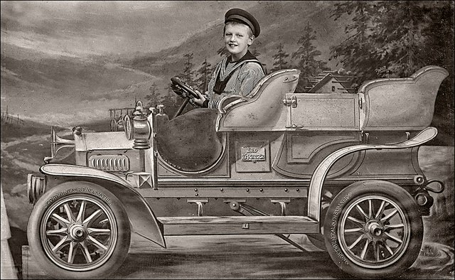 Auf Tour. Ein sehr detailgetreues Studio-Requisit eines Autos. Selbst die Reifen sind beschriftet. Fotograf: Julius Hoffmann, Bad Kissingen, Villa Martin. |