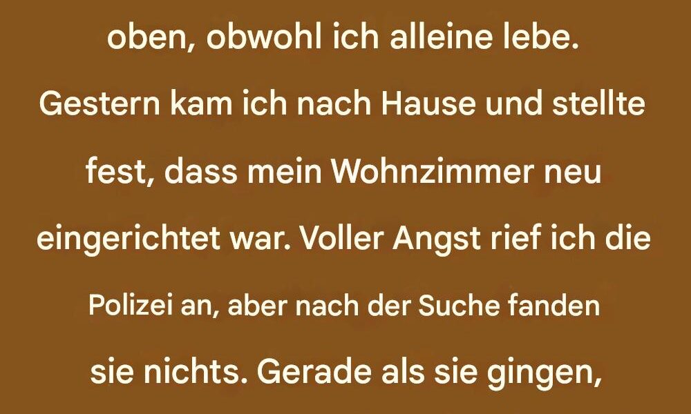 Ich kam spät vom Abendessen mit einer Freundin nach Hause. Sobald ich die Tür öffnete, merkte ich, dass etwas nicht stimmte. Das gesamte Wohnzimmer war verändert worden – unauffällig, aber unübersehbar. Die Couch war verschoben, die Kissen lagen verrutscht, ein Bilderrahmen hing schief an der Wand.